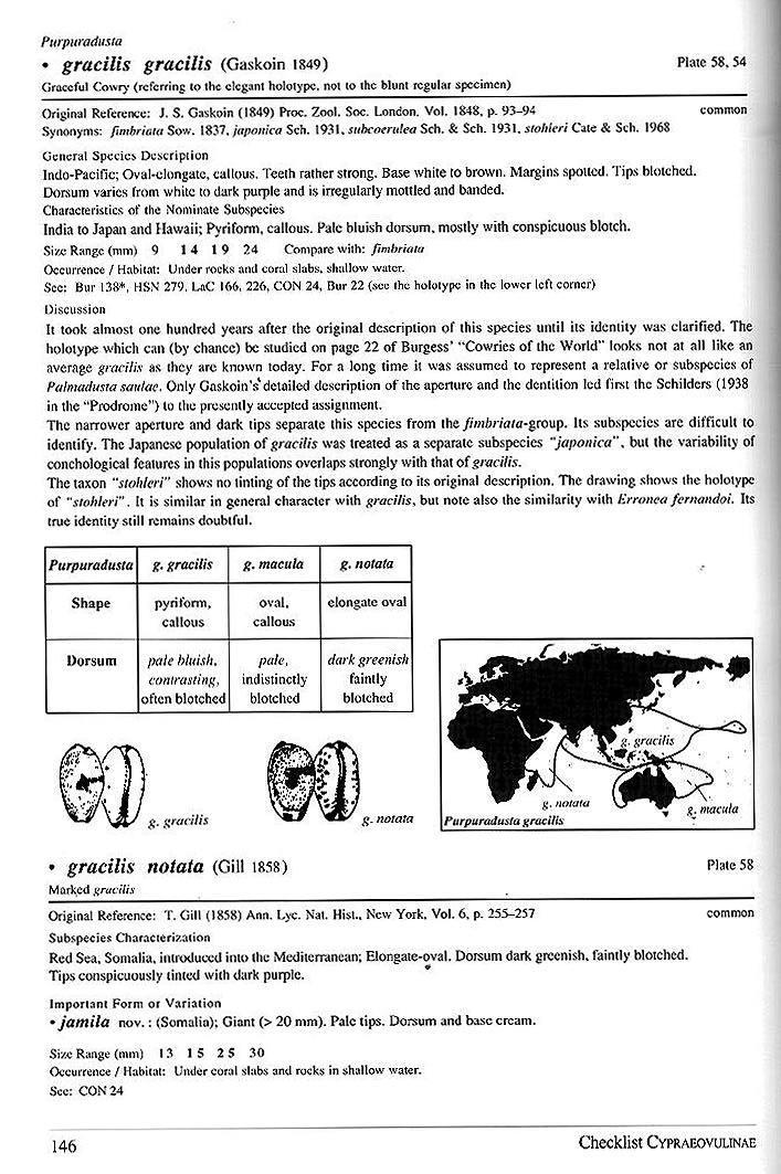 Our idea was to revise the family Cypraeidae on the basis of the Schilder's work by critically evaluating all data available to us, trying to find a balance between the splitter's and the lumper's points of view. There are 600 pages and 128 colour plates in this second, revised and enlarged edition. Thousands of specimens are illustrated, the genera, species, subspecies and many formae are listed, explained and compared on tables. The book is available now. Here are three sample pages (click on the thumbnail). |