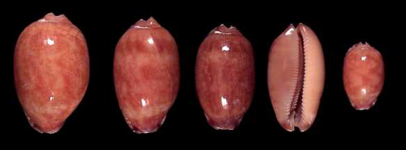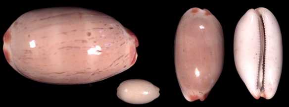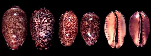 ![]() A common species found alongside ocellata, but often in deeper water. We have noted an interesting dwarf variety hardly exceeding 20 mm. The subfossil form is spectacular. there are shells with a yellow dorsum and a bluish-grey base, as well as giant specimens with corrugated labrum. |