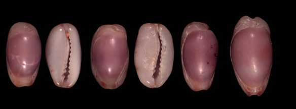 ![]() Common. A very variable cowry whose large form is rather common in the Galle area. Occasional specimens from this spot have the pattern resembling the rare variety merguina from Birma. Some specimens have a bright purple base (specimen on right). |