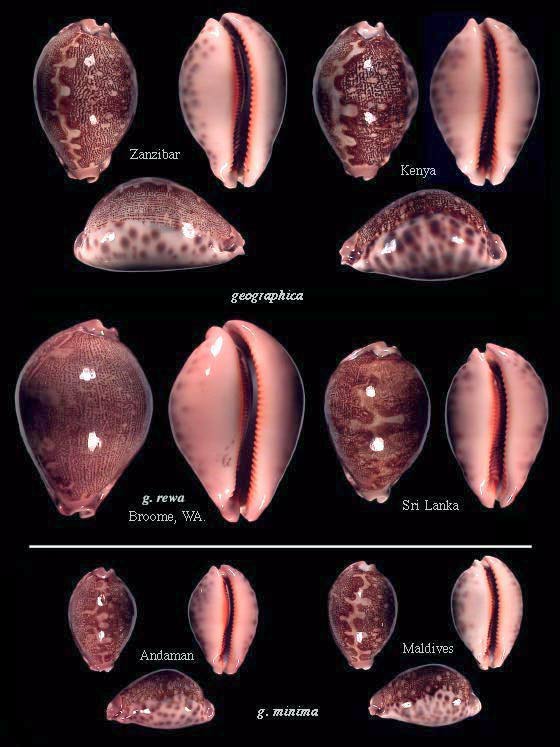 Leporicypraea g. geographica and its dwarf eastern variation L. geographica var. minima. According to genetic studies, the Western Australian shells belong to g. rewa rather than geographica geographica.