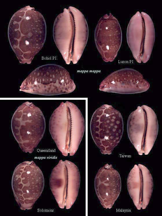 Revision of the mappas updated 12/2002 The systematic position of most so-called subspecies is probably that of valid species. One indication for this is the sympatric occurrence e.g. of geographica and rosea in East Africa, Madagascar and the Mascarenes, of viridis and rewa in the Central Pacific and mappa and geographica in Indonesia. Another indication is offered by genetic studies according to which the mappa-complex consists of as many as seven species (Chris Meyers, pers. comm.). Here I am making an attempt to find a reasonable compromise between splitting up the group and keeping it in an overviewable scale. The result from the conchological and zoogeographical comparison leads to three distinguishable groups (here listed as species), with two subspecies and several geographically confined forms. Individual colour variations have not been listed.