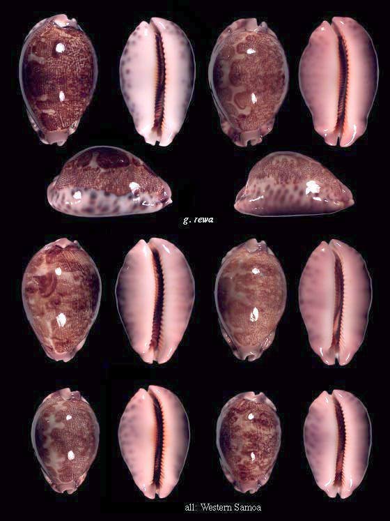 The type of geographica was claimed to originate from Indonesia. It is difficult today to assign the name to either the well known large shelled East African specimens or the smaller eastern populations known from Phuket Is. and the Andaman Sea. The main conchological characteristics of geographica are the somewhat irregular, almost blurred dorsal netting, the large marginal spots and the absence of a basal blotch. The shells are oval rather than cylindrical, the margins are irregularly pitted. These features are also found in the rare rewa from western Polynesia, which should therefore be assigned to geographica rather than to any other forms or subspecies of mappa. More pictures are here.