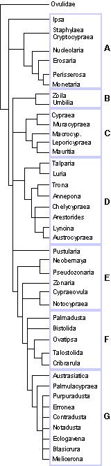 Zoila and Umbilia are fairly close relatives - well, the fossils and their geography suggest this. No great surprises in the Cypraeinae (groups C-D), just that you may notice that according to the DNA analysis, Annepona mariae is the closest living relative to Trona stercoraria!! Hardly to believe when looking at their shells.
