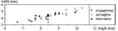 A comparative table (table 1) of width-to-length-relation of some randomly chosen specimens of P. oryzaeformis, P. serrulifera and P. minoridens shows the tendency of oryzaeformis to be smaller than serrulifera and somewhat narrower than minoridens.