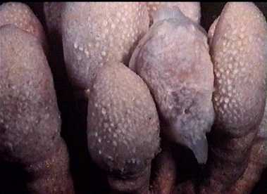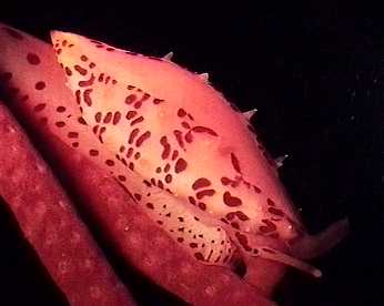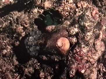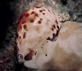 Trivia magnidentata in a colony of tunicates. The mantle perfectly camouflages the parasite animal