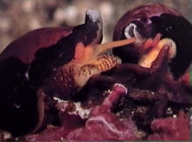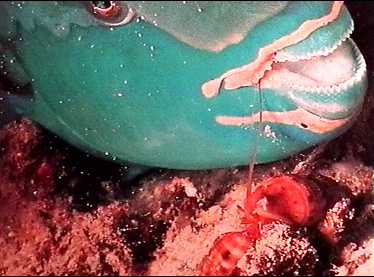 of a sleeping parrot fish being stung into its mouth by Colubraria obscura, now known as the "vampire-snail".