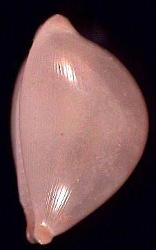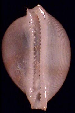 Sudadult shells of other Pustularia species are translucent and mostly white. The Western brevirostris is plain white, the extremities short and spiny. On the columellar side, a longitudinal denticulate ridge forms prior to the strong dentition, which develops as the shell reaches maturity. Also in cicercula and margarita, the young shells are white, translucent, with a comparable columellar ridge. The latter is typical in adult specimens of the rare Nesiocypraea lisetae, for which subadult cicercula or margarita are occasionally mistaken by dealers. In early stages of all Pustularia, the spire is still exposed. In such shells, the surface (especially on labral side) shows longitudinal growth ridges visible under magnification (Fig. 7). In cicercula and margarita, the subadult shells show two darker transverse bands that are never preserved in fully adult shells.