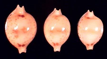 There are a few Gastropod families in which dorsally one side of the shell is the reflected image of the other - only basally the differences in the compositon of the two sides is apparent. In these cases we have a secondary optical relevation of the body symmetry, from an asymmetrical to a symmetrical shell. This phenomenon can be observed in the family Ovulidae, Triviidae and Cypraeidae, in which the species display a certain degree of bilateral symmetry in shell-shape and -ornamentation. Good examples are the genera Luria (e.g. pulchra (Gray, 1824)), Bistolida (e.g. stolida (Linné, 1758)) and, last not least, Pustularia (e.g. bistrinotata). May be, the optical bilatery escapes the food-scheme of molluscivore crustaceans which detect food by sight. In their habitat of narrow coral crevices, the Pustularia-species are usually inaccessible for molluscivore fish, which search for food by chemical rather than optical stimuli.