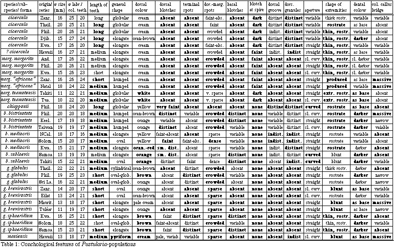 The data in Table 1 reveal that at least five species can be defined on the basis of consistent features. It is also apparent that a population of aberrant shells was examined whose conchological relationship to bistrinotata is obvious, apart from very constant features that suggest a distinction at the species level. This population is described below as Pustularia chiapponii n. sp.