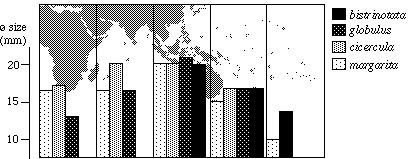 A set of shells from Oahu, Hawaii should be mentioned here, provisionally encorporated as ? cicercula in Table 1. Conchologically, these specimens have intermediate features between cicercula and margarita, as the dorsum is usually smooth on top but faintly pustulate towards the rostrated extremities. The teeth are very fine and unstained. The most striking feature is the reduction of the spire blotch, which is barely visible in some specimens.The systematic position of this population is so far under study.