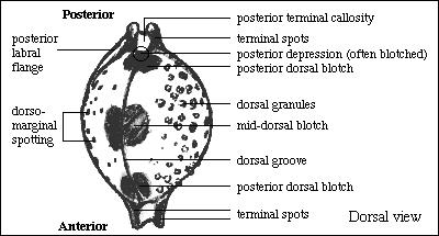 Dorso-marginal spots: The marginal spotting in Pustularia species usually extends also onto the dorsum, where it mixes with a very fine brown mottling or spotting. The latter is a very variable feature and was not compared, while the coarser spotting itself was found to be of relative importance. In granulose species, a spot usually occurs together with a granule.