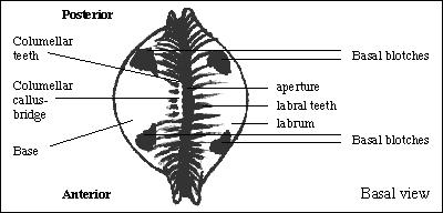 Basal blotches: In some Pustularia species there are two marked blotches on either side of the aperture. This feature was found to be of considerable importance for separation of species and subspecies. In some taxa, the blotches may be small, incomplete, or faint, and sometimes present only in a certain percentage of specimens. In those cases a statistical comparison may be important for identification, especially on the subspecific level.