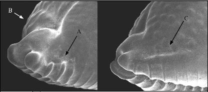 Terminal spots: Some species show a darker staining of the extremities visible only in the dorsal view. In Pustularia, this feature seems of little importance for species and subspecies characterization.