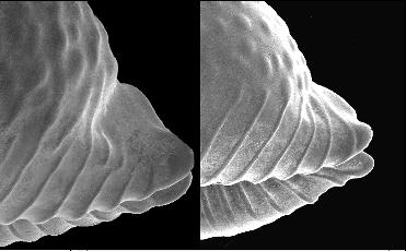 Fig. 4: The characteristic posterior extremity of a Pustularia. Left: P. chiapponii n. sp., right: P. bistrinotata. (SEM photos)