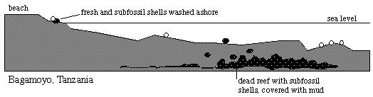 One of the best known sites bearing subfossil cowries is the long strip of muddy beach at Bagamoyo, the former capital of German East Africa, about 50 north of Dar-es-Salaam, Tanzania. Today, Bagamoyo is a run down place with some offroad-tourism but little other economy, but in former days it used to be the trade centre with an important dhow-harbour from which slaves were shipped to Zanzibar and Arabia. At Bagamoyo, extensive populations of some shell-types have been deposited in a deep layer of mud, presumably some ten-thousand years ago. After strong stroms with high tides, these shells are washed out of their substratum onto the beach. Some of these subfossils are rather common, the most famous ones being the "golden" Conus textile, and "golden" Naria helvola argella and Erronea caurica elongata.