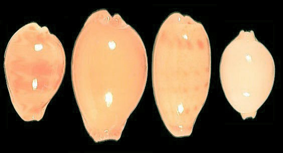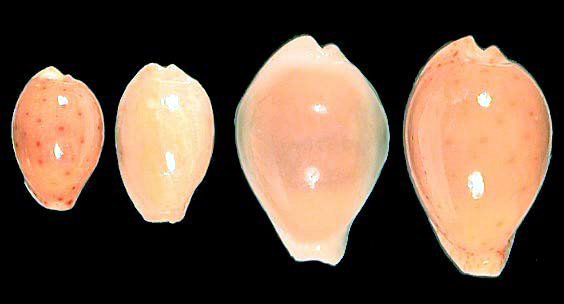 From left: Palmadusta diluculum (Bagamoyo), Staphylaea limacina interstincta (Bagamoyo), Blasicrura interrupta (Sri Lanka), Pustularia globulus (Maldives)