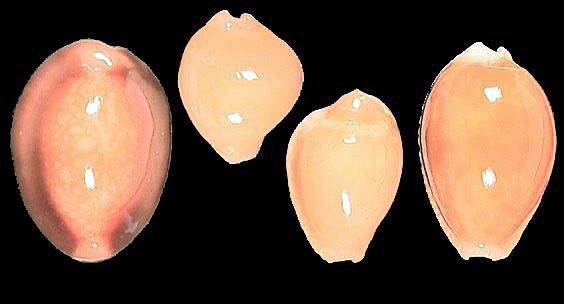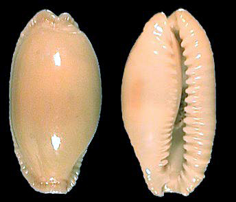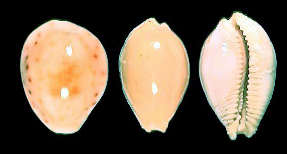 One would think that the longer the shell is dead, the stronger is the degree of erosion and loss in colour and pattern. In very rare cases, however, a single shell or even an entire cowry population got covered by sand or mud within a short period of time (a few days). Under certain circumstances the mechanical and chemical processes destroying the shells are stopped or considerably. If the deposition in this environment lasts, cowries may retain their nacre, but a pellucid appearance develops, and all darker colour components are lost. After a few thousand years, all colour is changed to shades of orange and yellow. Such shells have started their process of fossilization - the exchange of the chemical shell-components. The term subfossil may be used, independently from the actual age of the shells, as long as this process is not complete. We know gradual transitions from moderately fresh subfossils to fossil specimens of several cowry-species, always depending on the type of deposition. The age of these shells is often difficult to determine.