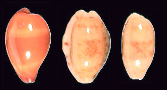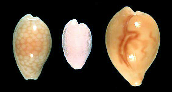 Left: Cribrarula esontropia (Mauritius), middle: Cypraeovula capensis (Fullers Bay, SA), right: Barycypraea fultoni fultoni (Natal, SA, dredged)